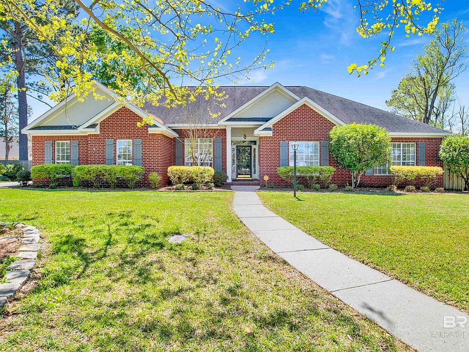 PRISTINE Condition in superb location in Daphne! Convenient to Shopping, Schools and I-10, this home is at the end of a cul-de-sac. NEWER ROOF -approx 6 years old. NEW HVAC Just a few months ago. TWO Water HEATERS. EPOXY coated floor in side facing garage. WHOLE HOUSE GENERATOR. HURRICANE SHUTTERS, One level, brick home, Trey Ceilings, smooth ceilings, recessed lighting, split bedroom plan, open floor plan. True Foyer to welcome guests into your home. Formal Dining room is open to great room, but has wall space for china cabinet or buffet. Dining room has wood flooring. Tile throughout great room and kitchen. Great Room has double tray ceiling, recessed lighting, ceiling fan, and fireplace. Kitchen has been beautifully renovated with raised panel cabinetry that go all the way to the ceiling, granite countertops, tile backsplash, under counter lighting, HUGE WALK IN PANTRY stainless appliances and double ovens. Great for entertaining with the formal dining room, breakfast bar and dining nook off kitchen. Office with BARN DOORS could be 4th bedroom. Primary bedroom with tray ceilings and ensuite bath. Ensuite bath with soaring ceilings, double vanity, loads of cabinetry, soaking tub, separate shower and large walk in closet. A SECOND PRIMARY bedroom on opposite end of home, has ensuite bath. You will love all the sunshine that comes indoors or you can enjoy the oversized SCREEN PORCH and there is a 16X10 MAN CAVE or SHE SHED (whoever claims it first). Extra wide driveway. SECURITY SYSTEM. FRIENDS ENTRANCE on side of home. All information provided is deemed reliable but not guaranteed. Buyer or buyer’s agent to verify all information.