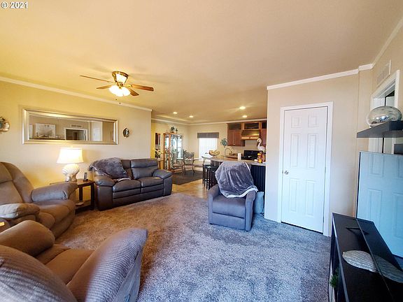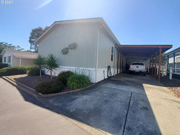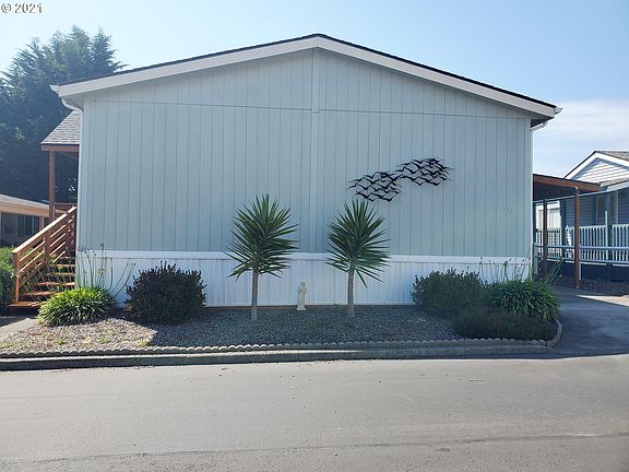 3 bed/2 bath in a 55 and older park right around the corner from the Port of Brookings. Open floor plan with master separate from other bedrooms. Third bedroom makes a great office with exterior door to the back. Extra deep carport, tool shed and cute little fenced yard with covered deck. All kitchen appliances and washer/dryer included. Space rent of $410 covers water and sewer. This well kept Home with tasteful upgrades won't last long! Call today for a personal or virtual tour.