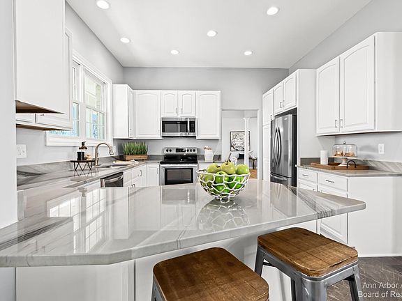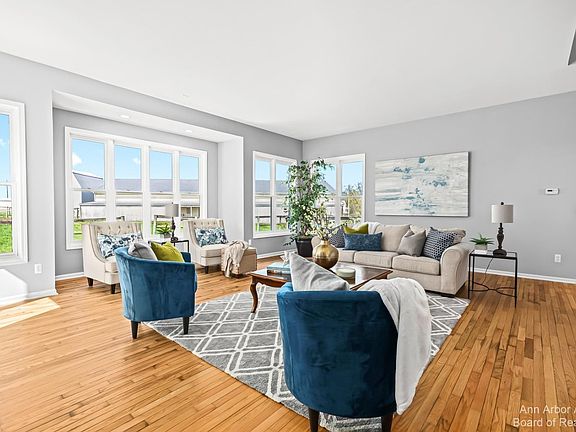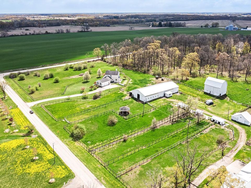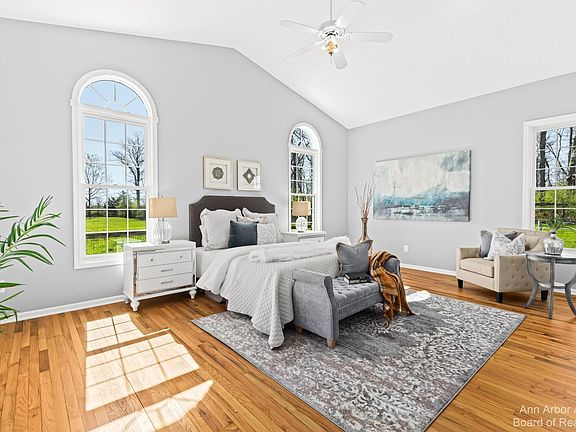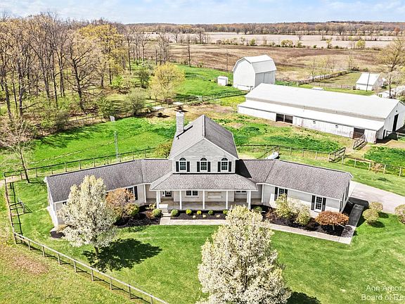 Stately brick home situated on a 74-acre farm is ready for immediate occupancy. Located just 10 minutes outside of Saline and 20 minutes from Ann Arbor. Upon entry, you'll be greeted by lovely hardwood flooring that flows from the formal dining into the great room with gas fireplace and is flooded by natural light from the wall of picture windows with SW views of the property. The kitchen is smartly tucked aside, hiding messes, and offers white cabinetry with granite counters, stainless-steel appliances, and breakfast nook with slider leading outside. The primary suite occupies a wing of the house and showcases a vaulted ceiling, primary bath with spa tub and separate shower, and large walk-in closet. Upstairs, find 2 additional large bedrooms that share a Jack and Jill bath. Additional f features include a private study and a large 2,400 square foot daylight basement w/ 10 foot ceilings equipped with a full bath and can be finished as desired. Multiple outbuildings including a large 6,000 square foot barn equipped with over 20 stalls and all up to 2023 electrical code. This is a cash-only sale. Solar panel easement on property., Primary Bath