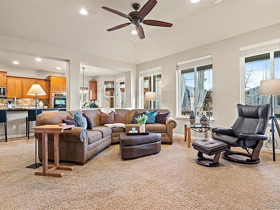 MOTIVATED SELLER! AMAZING opportunity to own this RANCH style home with a walk-out basement AND INCREDIBLE VIEWS! So many reasons to love this 5 bedroom, 4 bathroom home starting with the "Great Room" feel of the living room, dining room and kitchen! Enjoy the living room with lots of natural light and an elegant tile fireplace. The spacious dining room has stunning hand hewn cherry wood floors! The expansive kitchen features tile counter tops/backsplash, island, stainless appliances, updated light fixtures and a convenient built-in desk area! Don't miss the walk-in pantry! The kitchen has direct access to the extended patio and pergola overlooking the beautifully landscaped backyard. The primary bedroom boasts a bay window, tray ceiling, and wonderful mountain views! The primary 5 piece bathroom with soaking tub, leads to everyone's dream closet with built-ins and pull out shoe racks! Convenient main floor laundry room with a utility sink, built-in shelves and drying racks! The walk-out basement is complete with a stone fireplace, beautiful book shelves, surround sound, big screen and a floating soffit ceiling with premier lighting! The lower level has a gym, 2 additional bedrooms with egress windows, and an unbelievably stunning 3/4 bath with a wood ceiling, glass tile and a circular shower! The 5th bedroom in the lower level consists of 2 rooms and was used as a recording studio, thus the back room is sound proof! Plenty of storage in the basement as well! The 3 car garage has cabinets, shelving and a loft perfect for all of your tools/toys. The front custom gated courtyard provides a very tranquil setting for your morning coffee or your favorite sunset drink. The entire exterior is meticulously maintained with mature landscaping! The end of the cul-de-sac location is the perfect place to appreciate the impressive mountain views. BONUS: NO HOA. This location is a short distance to Old Town Arvada and light rail! Come the amazing Arvada lifestyle!