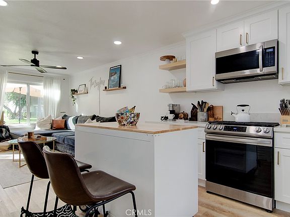 Welcome Home! You will love this property and all the beautiful updates and finishes. The home has a lovely sitting area in the front yard, which is perfect for entertaining. As you enter the property, you are greeted by beautiful luxury vinyl flooring that spans the entire space, a fabulous new kitchen including cabinets, floating shelves, quartz countertops, sink, and faucet. You have a guest powder room just off the kitchen along with a built in area for washer/dryer and STORAGE! The back patio brings an additional element for more living space to host family and friends. Upstairs you have the primary bedroom, guest bedroom and full bathroom. Additional upgrades include: ceiling fans, new paint throughout, baseboards, crown molding and new doors upstairs. The Community offers two Pools, two spas, clubhouse, two children's play areas and beautifully landscaped grounds.The home has one assigned carport with storage and one parking pass for street parking! You do not want to miss this one!!
