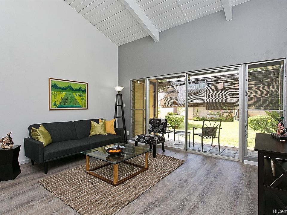 OPEN HOUSE: Sunday 3/7 from 2-5. Spacious 3 bedroom, 2 bath corner townhouse in Chateau Newtown w soaring cathedral ceiling and covered lanai that looks out to grassed area. Main bedroom/bath downstairs and 2 bedrooms/bath upstairs. New laminate flooring and freshly painted downstairs, fresh paint. Two assigned parking stalls very near to entry to house. Ample street parking for your friends and family. Pets allowed in a reasonable number. See supplements for House Rules. Conveniently located close to H1, Pearlridge Mall, Pearl Harbor Navy Base, and everyday amenities like shopping, restaurants and recreational facilities. Part of Newtown Community Association.