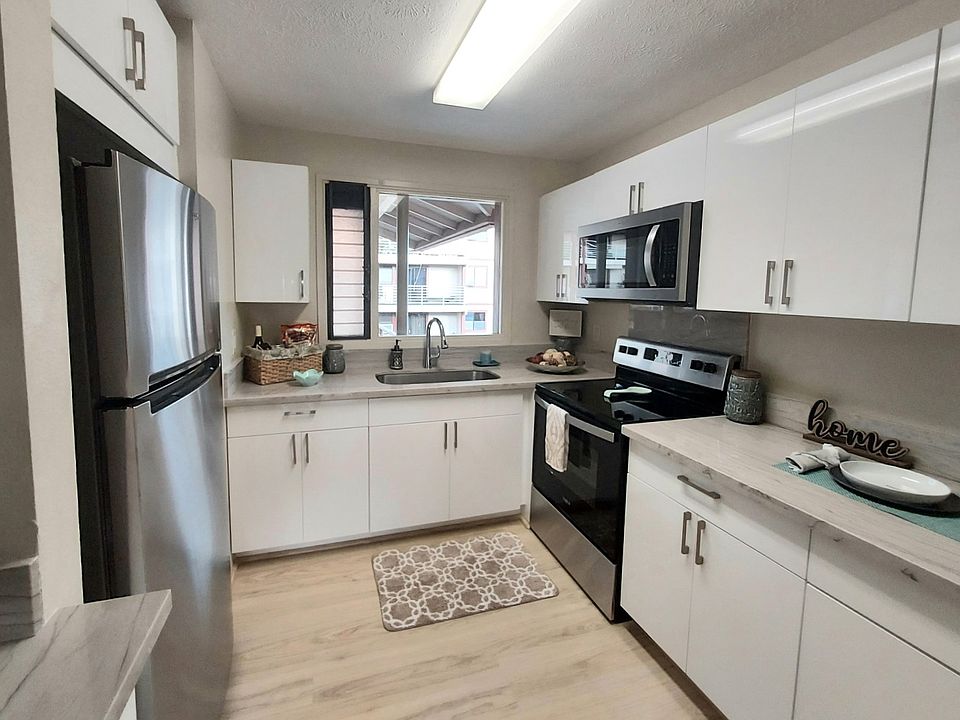 Don't miss this 3rd floor (stairwell access only) charming 2-bedroom, 1-bathroom residence recently remodeled with new white kitchen, stainless steel appliances, and larger sized washer/dryer in the living room. Unit comes with 2 parking spaces right in front of the unit, community pool, BBQ area and guest parking. Sweeping views of Pearl Harbor and stunning sunsets right from your own private lanai, Pearlridge Mall and surrounding shops and restaurants nearby. Ceiling fans and window AC unit ensure year-round comfort. 6 month lease to start with option to renew. Rented UNFURNISHED. Renter's liability insurance of $300k minimum required.