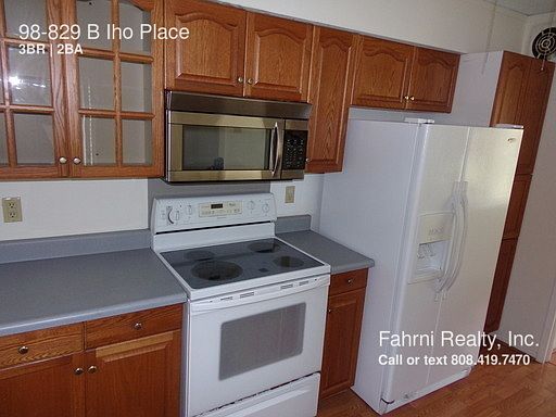 SCHEDULE A SHOWING ONLINE AT: showmojo.com/lh/6d068460c1 Aiea- Ridgeway (98-829B) Iho Place. Great Location Nice Partly furnished 3 bedroom 2 bath split level townhome. Enclose lanai for more living. Home includes water, refrigerator, range, washer and dryer. Close to Military base, Pearl Ridge Shopping Mall, Theater & Schools No pets. Fahrni Realty, Inc. 808-486-4166