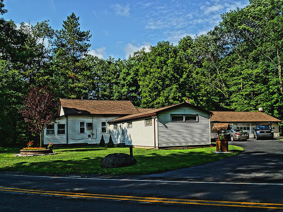 This home is not only a corner stone in the community, but a historical figure in the area. The living area of the home started out life as a 1 room school house. The Halterman family, Price family, and other well known names in the area all had family members in attendance here. When the Poconos became a major tourist attraction and not just a weekend getaway for second home owners, this quaint schoolhouse was no longer fit to suit the family that owned it. In 1955 when this house was turning into a larger home, East Stroudsburg had experienced a flood. A local beer distributor was friends with the owner who had a large inventory of bottled beer which had been submerged in flood waters. Not wanting to throw it all out, the business owner came to his friend on Barren Rd who had a root cellar built into the hillside along Wooddale Rd. This root cellar, which is still visible today in the homes back yard, became home to a large stock of brews rescued from the flood! As the family grew, and time became available they built on a kitchen / dining area and upgraded to modern facilities abandoning the outhouse in the back. A 4 bedroom wing was added later still, to accommodate all the children. The owner being a talented individual also build a multi car garage with attached workshop to have a nice big space to work on crafts and hobbies. This new home had a sign posted "Three Oaks" which was quite aptly named for (3) 100+ year old Oak trees which stood on the property. Although 1 has succumb to gravity, in the subsequent years several more young trees have matured and now become prominent features in the landscape of this home. One stands on the corner of Barred & Wooddale Rd. If trees could talk, this one would have quite a story to tell. From all who may have climbed it, enjoyed lunch under it, or were dropped off by horse and buggy near it at the main entrance to the original schoolhouse. The original stone walkway buried in the front yard leading to the road, which the current owner recently located, carefully excavated and is in the process of resetting, will to bring back even more of the homes original rustic charm. This area is known for an abundance of stones, rocks, and boulders. For some this may be challenging, other may see it as a challenge, such as the ambitious current owner. When life gives you lemons.. you make lemonade. This is apparent surrounding the entire property from the hand laid stone wall around the new side yard, to the ponds and waterfalls alongside a peaceful fire-pit in the back all built mostly from rocks gathered in the woods surrounding the property.