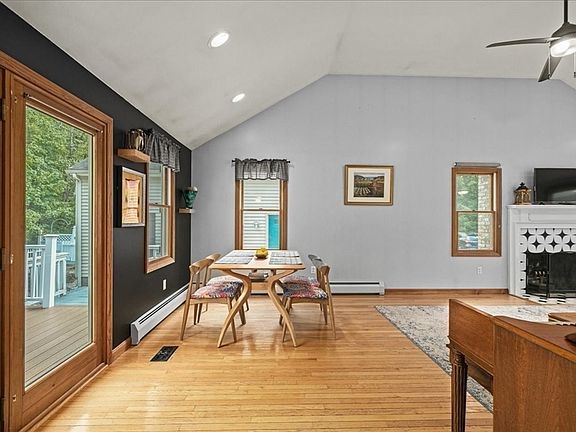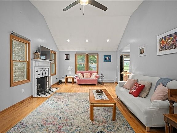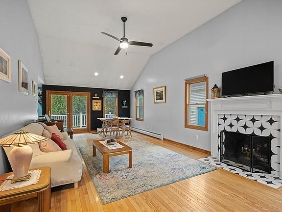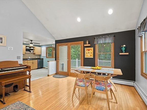 Custom built young ranch on a one acre lot near to Cedar Lake recreation area. Inviting, covered front porch. Front to back living room/dining room with hardwoods, fireplace and cathedral ceilings. Extra large primary suite (big enough to be split to create a 3rd bedroom) with vaulted ceilings, en suite bathroom, doors to back deck. Second bedroom and guest bath in hallway. Updated kitchen with black stainless steel appliances and stylish backsplash opens to dining area which has another set of doors out to the back deck. Additional finished space in lower level - pellet stove and ceiling vents for heat. Would be great area for rec room, movie room, craft room -- wired for surround sound. Nest thermostats. Town water/sewer. Beautiful stone walls. Oversized 2 car garage perfect for the car enthusiast. Large Klotter Farms shed. Fenced in area behind garage for dogs. Trex deck goes the width of the house - great for entertaining.