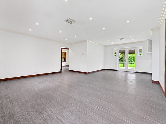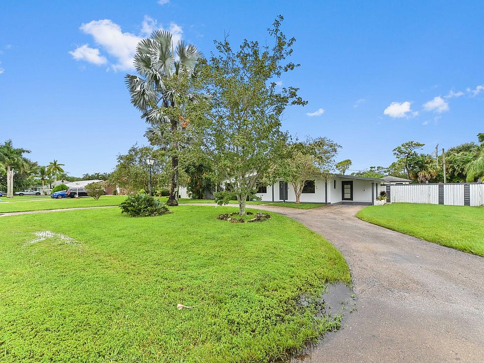 Welcome to this charming single-story home located in the desirable, non-HOA community of Florida Gardens in Lake Worth, FL. This delightful property offers 3 bedrooms and 2 bathrooms, perfect for those seeking a comfortable and serene living space. As you pull into the circular driveway, you'll appreciate the attached carport and the inviting front covered porch, a perfect spot to relax. Inside, a spacious living room flows into the dining area, which opens to the patio and backyard through elegant French doors, providing a bright and airy atmosphere. The galley-style kitchen boasts quartz countertops and is adjacent to a convenient laundry/storage room, making it ideal for daily living and meal preparation. The main bedroom offers privacy and comfort with its walk-in closet and ensuite bathroom. Whether you're enjoying a quiet evening or hosting guests, the home's open patio and expansive backyard are perfect for outdoor activities. This well-maintained home is nestled in a peaceful neighborhood and is just minutes away from excellent shopping, dining, and entertainment options, offering the best of Florida living. Don't miss out on this unique opportunity to own a home in this sought-after community!
