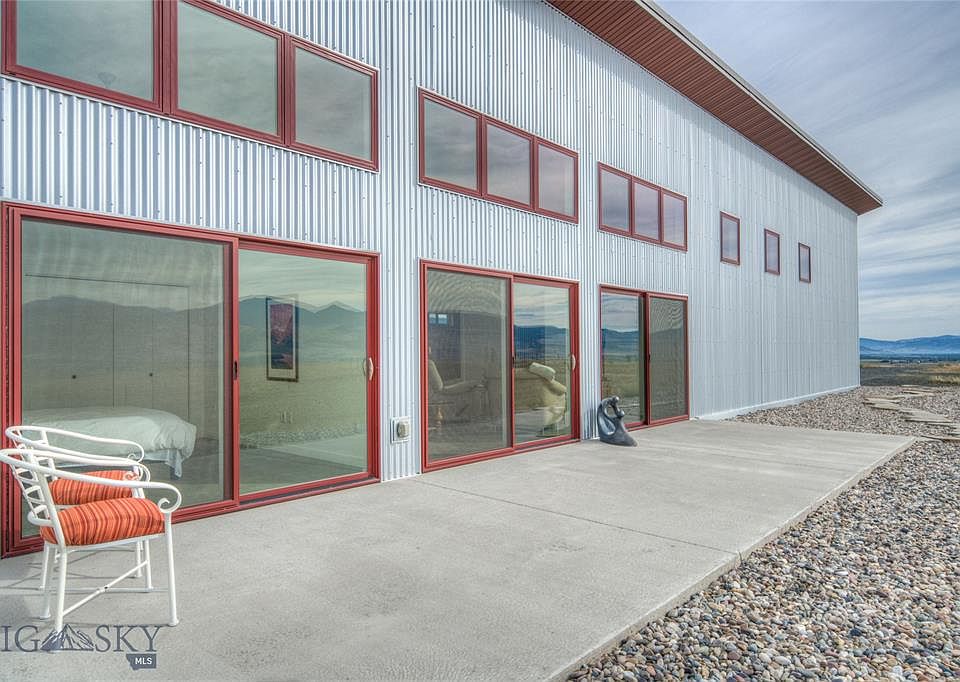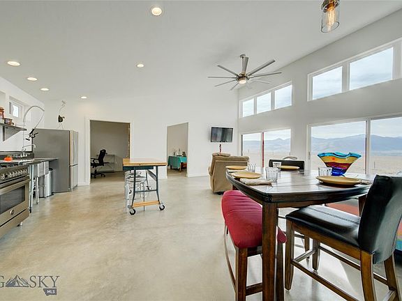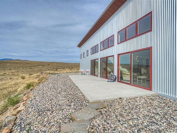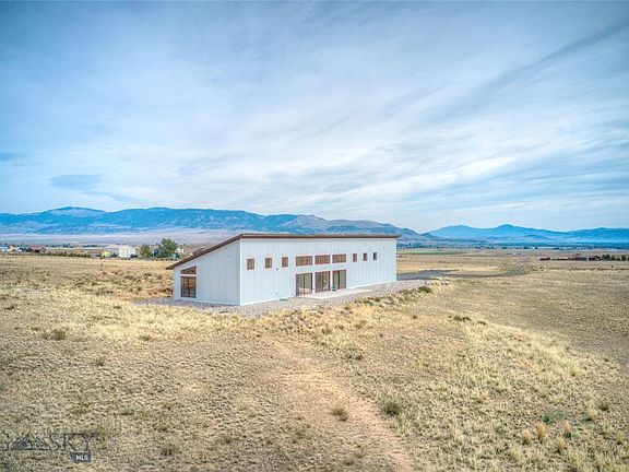 Unobstructed mountain views from this 2018 custom contemporary suggests you are in the middle of nowhere on 18+ acres bordering hundreds of acres of state land. Nearby I-90 has time efficient commutes to Bozeman & Butte. Step inside the all one level, open floor plan with elements of urban warehouse vibes, European influence, and cozy Montana character. The high ceilings & concrete floors run throughout the entire home for a spacious, seamless & inviting feel. The kitchen has been appointed with commercial stainless fixtures including a Bertazzoni range, and custom walk-in pantry. The dining/living room area makes for the best entertaining. Located just off the living room, two study areas, that may serve as bedrooms. Two spacious bedrooms and two full baths, one master on-suite with a claw foot tub and second bath with oversized glass & steel walk in shower. Attached OVERSIZED two car garage. With the right offer, this home can be sold furnished including outdoor sculptures.