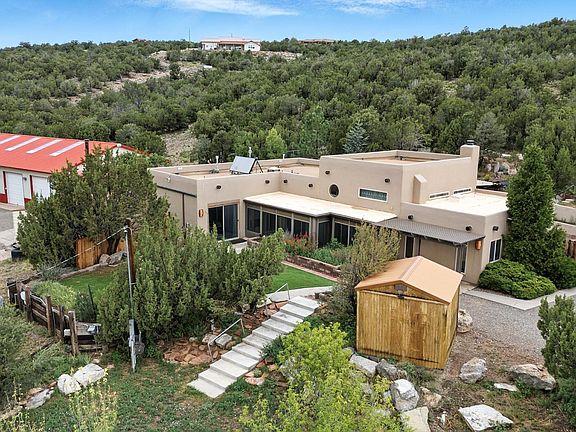 Newly Reduced! Set on 5.5 scenic acres of wooded hillside, this Southwest-style home offers privacy, natural beauty, and timeless charm. Skylights fill the space with light, highlighting the kiva fireplace, nichos, and chef's kitchen. Enjoy a sunroom, ample storage, and outdoor living with a covered patio, fenced yard for pets, and expansive space for work or play. The property includes an oversized 4-bay garage/shop with lift and half bath, plus two sheds, a tractor shed, and large carport--perfect for hobbies, projects, and equipment.Schedule your private viewing today via Showingtime!