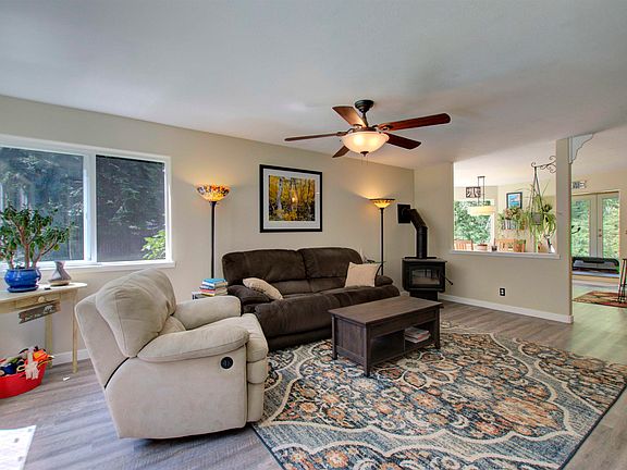 Beautiful 2,160 SF, 3-BR, 3-BA, cedar sided home in quiet country setting! Kitchen and dining area has great light. Extra-large windows let natural surroundings in! Start up the wood stove in the winter with inexpensive wood heat. All kitchen appliances, washer, dryer are new and garage freezer are included. Main level bonus room can be used for exercise room, office, or hobby room. Main level bedroom and bath, extra-large loft/family room upstairs with primary suite on second level. Recent interior paint, flooring, light fixtures and trim throughout. 30-year roof installed in 2016. Nicely landscaped yard with flowers and garden areas. Private back yard deck provides added enjoyment. Fenced back yard includes water feature and pond. Front and back automatic sprinkler landscaped areas make this property easy to manage. Great 2-car attached garage with work area lots of storage. Additional "red barn" storage shed is on property for your tools, equipment, and toys.