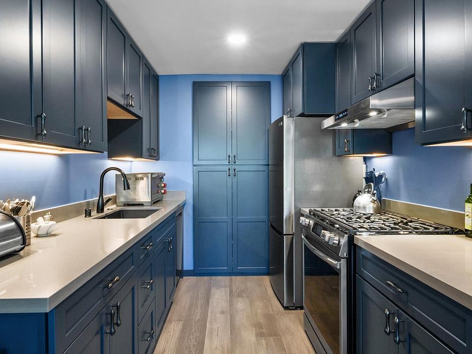 Beautifully updated light-filled condoModern sinkContemporary lightingThoughtfully remodeled homeBathed in natural lightSleek stone countertopsCustom cabinetry