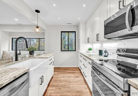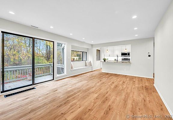 Move right into this newly renovated Ethan Allen with beautiful woodland view. Natural sunlight floods the spacious living room with dining area and accent wall. New open concept kitchen with breakfast bar, Shaker style cabinets, quartzite countertops and upgraded stainless steel appliances and two pantries. Gorgeous wood look luxury vinyl flooring throughout. Two new fully tiled baths each with 5' shower. Recessed lighting throughout. Brand new heat pump system with central air! Short walk to nearby garage with no steps! Western exposure for maximum sunlight !