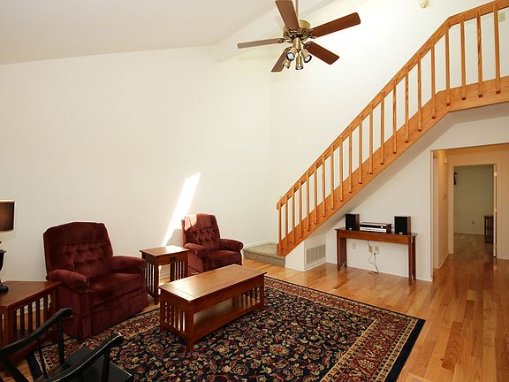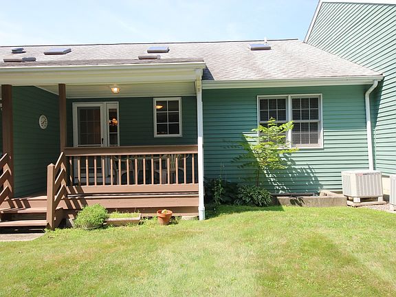 Exceptionally bright and well maintained Ranch Style Unit in a 55 and over community. The open floor plan offers a vaulted ceiling in Living Room with stairs to unfinished attic with 2 skylights; formal Dining Room, large fully applianced Eat-In-Kitchen with skylight and door to covered porch. The main level Master Bedroom has a walk-in closet and full bath. Other features include: new, gleaming hardwood floors, 1/2 bath, and a new hot water heater. The Lower level is partially finished with a carpeted and heated room and additional storage areas. There is an attached 1 car garage and 2 covered porches. Rear porch overlooks beautiful, private grounds.