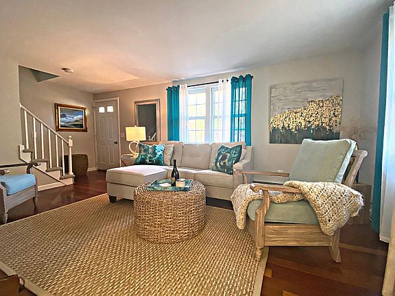 Nestled in one of Sandwich's loveliest neighborhoods, this charming centrally located 2 bedroom, 1.5 bath condo-style townhouse is ready for a new owner. A gorgeous newly remodeled kitchen was updated in 2021 with quartz counters, stainless steel appliances and shaker-style cabinetry. Exit out the kitchen to your private deck - perfect for dining alfresco, or relaxing with a good book and a cocktail on a sunny afternoon with nature as your backdrop. Enjoy the quiet, peaceful natural setting that having a tree-lined back yard provides. The deck overlooks a huge yard which is perfect for games and gatherings. Upstairs you'll find 2 spacious bedrooms with sizable closets and a shared full bath. Second bedroom is perfect as a work from home space. This unit has been meticulously maintained with many professional upgrades including a new roof, hardwood floors, fresh paint, new electrical panel, mini splits and more. Substantial space awaits in a clean basement with laundry and exterior bulkhead access for easy storage. No HOAs, no fees, no rules, lots of parking and currently the lowest price home in Sandwich! You own the land with your neighbor. Truly turnkey -- just arrive and enjoy!