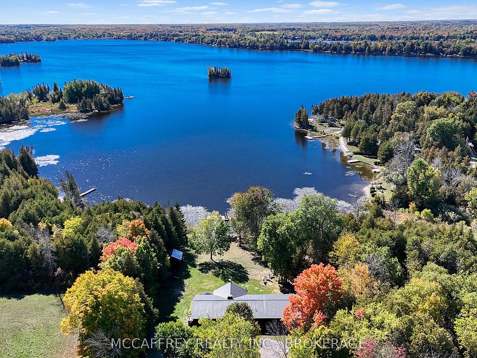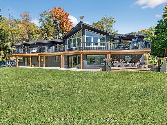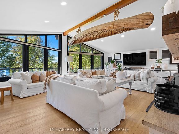 Welcome to your private lakefront sanctuary - where elegance, scale, and serenity meet. Set on 3.8 acres of wooded privacy and boasting an impressive 259 feet of natural Beaver Lake shoreline, this extraordinary retreat offers over 5,000 square feet of finely renovated living space. Tucked into a tranquil bay, you'll enjoy peaceful waters free from heavy boat traffic, all while being part of a warm, welcoming community. A long circular driveway makes a grand approach, leading you to the homes timeless exterior and detached heated garage. Step inside and feel the airiness of soaring 12-foot cathedral ceilings, expansive windows, and wide-plank floors that capture every angle of the lake. The open living space blends comfort and sophistication, anchored by a cozy wood burning fireplace and panoramic water views. The chefs kitchen is a showpiece in itself, featuring a quartz waterfall island, built-in appliances, and seamless flow into the dining area. Open the 12-foot glass wall to step onto the deck -perfect for morning coffee among the trees or golden sunsets over the lake. With 6 bedrooms and 5 bathrooms, this home was designed for hosting family and guests in total comfort. The main-floor primary suite is a private retreat with a spa-inspired ensuite, soaker Jacuzzi, glass shower, and walkout to its own deck. Additional bedrooms, including a secondary ensuite, provide ample space for visitors. The walkout lower level expands the living space with a bright recreation room, office, second laundry, four additional bedrooms, a full bath, and generous storage. Step outside to your private waterfront oasis: a T-shaped dock for swimming and boating, a gazebo for shady afternoons, and a charming bunkie for weekend guests. This is more than a home - its an elevated lifestyle. Privacy, scale, modern design, and natural beauty come together in perfect harmony.