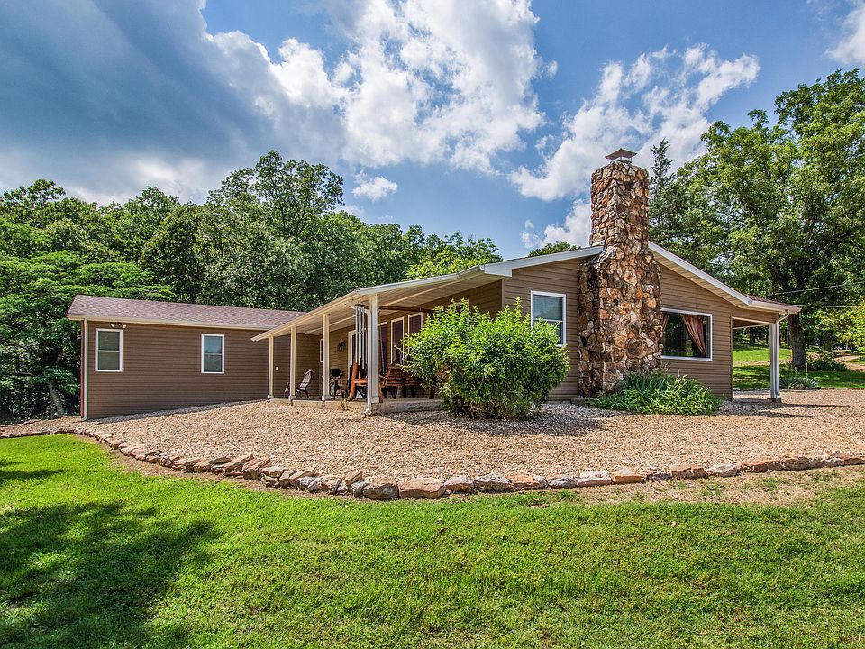 Your search may be over. Sitting on 15 acres adjoining the Bull Shoals Lake Shoreline with a stunning year' round view of the water, is this 1800 square foot, 3 bedroom, 2 bath home may be just what you are seeking for your lake get-aways, your retirement, or for a great place to raise your family. It has vaulted ceilings, central heat and air, a fieldstone wood-burning fireplace, and rooms that take full advantage of the view. A covered patio adds to the indoor/outdoor appeal. Located not far from the paved launching ramp at Spring Creek, and within 12 minutes of town, the house is set back from the county road just far enough to provide seclusion among the trees. There are about 10 acres of woods here, interspersed with 5 acres of partially cleared grassland. No other houses are in sight. Included are a private well and septic system and two 3-car+ garages/shops for your vehicles and toys. A near new architectural shingled roof covers the one level country ranch style home. You can wake up here to a pristine lake view from your master bedroom, slip into the kitchen for coffee and drink in the view from the great room. Come and see it. Then you'll need to rent a moving truck. You'll have found your place.