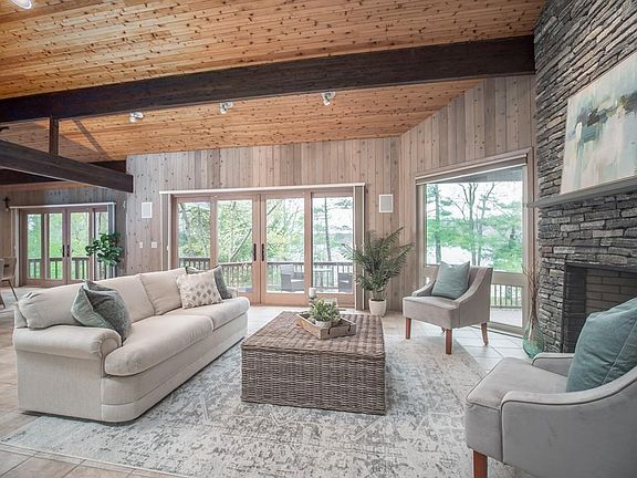 Lake front Paradise! Rare offering on Lake Waschacum is your own private resort! This stunning contemporary is designed to surround you with nature inviting in the peacefulness of the lake. The walls of glass on all levels frame the lake and compliment the soaring wood ceilings. A desirable open-floor plan. Living room with stone fireplace, sunroom streaming in light. Multiple decks. The 1st floor master is a retreat with private deck. The lower level is a home-within-a-home with a fireplace, family room, second kitchen and dining, custom home office and a bath-a perfect arraignment for out-of-town guests or lakeside entertainment. Generator. Too many details to list! A large deck dockside is a wonderful place for celebrations or just to relax at the water's edge! Play tennis on your own court! A second garage for water toys! Boating kayaking, swimming all in your back yard! An exceptional property! The lifestyle you've been dreaming of! One year home warranty included.