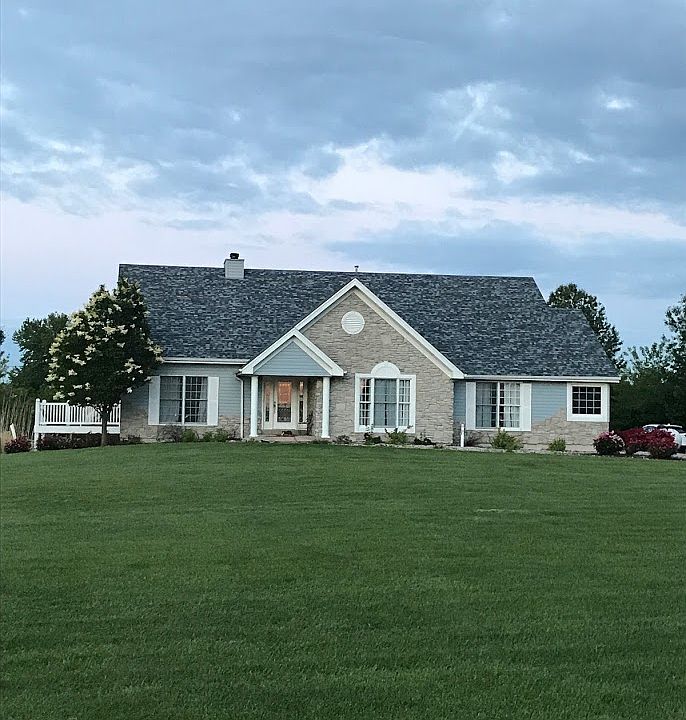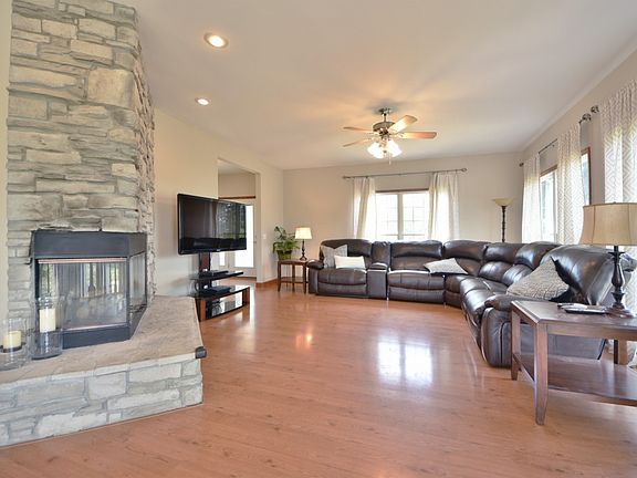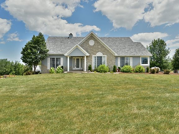 Situated upon a 4+ACRE LOT w/ a large PRIVATE LAKE & DOCK backing to WOODS, this wonderful 3 bed/3 bath stone front atrium ranch is guaranteed to impress! The inviting open fl plan welcomes you with a formal entry foyer that flows naturally into the spacious great rm with a floor-to-ceiling stone fireplace & WOOD FLOORS. You will enjoy the bright eat-in kitchen featuring custom cabinetry, center island, breakfast bar, wet bar, recessed lighting, ceramic tile fl & fresh paint, & adjacent dining rm with an atrium w/o to the deck + an atrium stairwell to the FINISHED LL adding a large family rm w/2nd fireplace & Atrium w/o to the patio, a rec rm with wet bar, den/rec rm & a 3rd bath with new flooring & paint. Relax in comfort to the large master suite that includes an 11x8 walk-in closet & luxurious private bath with double vanity, corner lounging tub, walk-in shower & new flg. Home features a HUGE DETACHED GARAGE with a pellet stove,/WORKSHOP insulated walls & additional 4+CAR STORAGE.