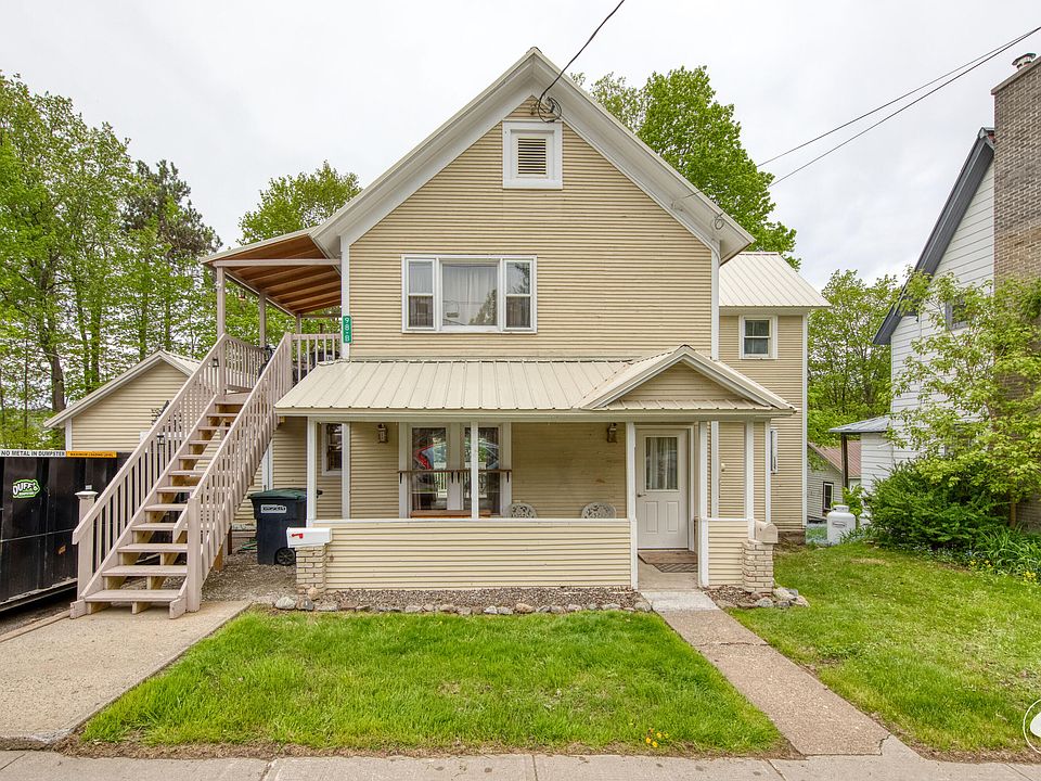 Located perfectly in the Village Saranac Lake, this 1930's era house features two units. With three bedrooms and two baths the first floor apartment allows for easy access. Oversized primary bedroom, newly tiled bathroom and knotty pine accents make this unit even more attractive Large dining room with glass doors that open out to the deck overlooking the private back yard which connects directly to the popular rail-trail.