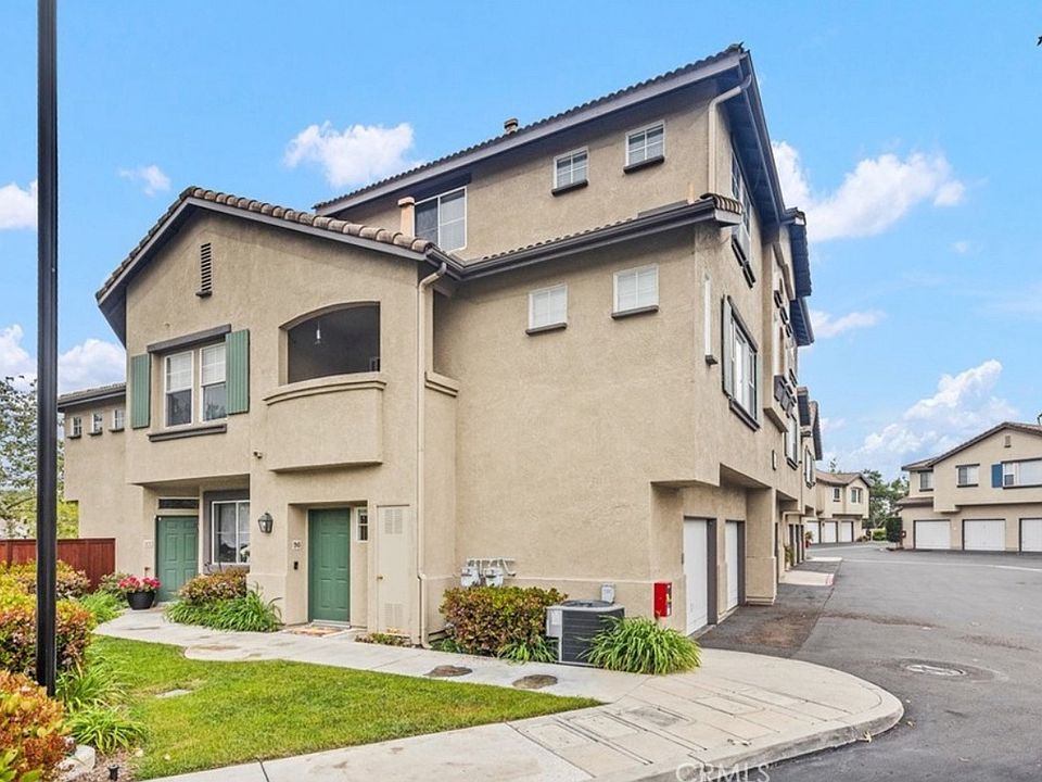 This lovely condo offers a perfect blend of modern style and comfort. As you step inside, you'll walk up the stairs and be greeted by a spacious open floor plan adorned with engineered wood flooring throughout the first floor. The updated kitchen is a culinary dream, boasting new white cabinets, beautiful white quartz countertops, and a modern, stylish backsplash. The kitchen island with cabinets provides ample storage space, complemented by soft close drawers and pullouts, making organization a breeze. Stainless steel appliances add both functionality and sophistication to the space. A cozy fireplace with modern tile surround serves as a focal point for the family room. Step out onto the charming balcony off the dining room, where you can enjoy neighborhood views and soak in the tranquility. Being an end unit means there's no one in front of you, enhancing your privacy and peaceful living experience. Upstairs, you'll find a spacious primary bedroom featuring a modern wood accent wall and custom cabinets in the closet for all your storage needs. The secondary bedroom also offers custom cabinets in the closet, maximizing space and organization. The updated bathroom delights with a new vanity featuring dual sinks, modern tile flooring, and an upgraded shower/tub combination, creating a spa-like ambiance. Convenience is key with a one-car attached garage and an additional parking spot included. Take advantage of the community pool and spa, perfect for relaxation and leisure. With schools within walking distance and shopping and the toll road in close proximity, you'll enjoy easy access to swimming pool, playground, park, walking path.