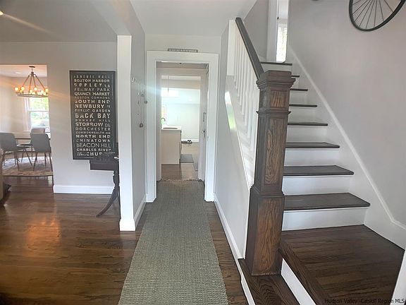 This adorable, newly renovated Cape style home (c. 1938) says, "Ahhh, Home Sweet Home" and "Move Right In!" as soon as you drive up. The covered front step and foyer beckon you into gleaming hardwood floors throughout. Well-positioned skylights and windows galore create a home where old-world charm meets an open, fresh, bright new feel. The Living Room is anchored by a lovely brick fireplace and wood mantel. Surprise! There's a windowed bonus space just behind the fireplace. The current owner uses it as an office... a place to meditate, relax and read a book. (It could also be used to expand the downstairs 1/2-bath into a full bath if desired.) The new first-floor bath has great Moroccan tile and a barn door. The nature of this house is expressed as you easily drift through the Living Room, Dining Room and into a stunning new kitchen (open, crisp, white). This is an open "great room" floor plan rarely seen in an older home. There's room for two gourmet cooks in a kitchen with a sink island that faces your guests and keeps you connected... making entertaining a pleasure. An Eat-In nook w/sky light and a door out to a large deck give great access to BBQing and dining al fresco. The deck overlooks an ample and fully fenced lawn. Let the dogs out while you pick tomatoes from your raised-bed gardens. Play badminton or add a hot tub... as there is already electric service available. And what about upstairs? Wind your way up a charming staircase and a continuation of the hardwood floors. There's a large main bedroom that feels enormous under its vaulted and beamed ceiling with a huge, square skylight. A full walk-in closet is also a lucky find. There are 2 more large bedrooms and a full bath with two sinks--two sinks is always a good thing! Each bedroom is oversized with great windows and closets. There's extra storage beneath the deck and house and access through a regular door into a full basement w/laundry and tons more storage. The attached garage steps you right into the kitchen, so dropping off the groceries is a snap. And, the garage has even more room for tools or exercise equipment... or whatever you wish. This house is located in the sought-after Arlington School District. A few feet away from a wonderful luncheon spot and deli. Close to everything Poughkeepsie has to offer and only 1.5 hours from NYC by car or Metro North Train. Updates were made soup-to-nuts in 2017 and include: a tastefully renovated kitchen w/subway tile backsplash and quartz counters; updated baths, new boiler, energy-efficient windows and an upgraded electrical panel, to name a few.