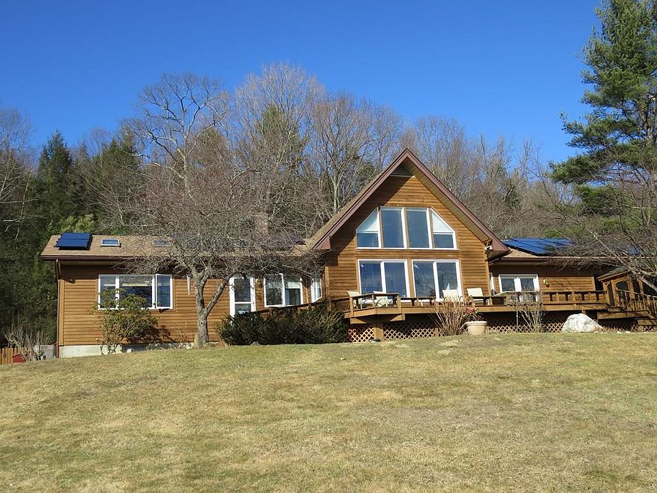 8 Room Contemporary Ranch w/Views, southern exposure, 34 gorgeous acres and only 8 minutes to center of Williamsburg. Enjoy the Mill River with swimming holes and waterfalls right on your property! The wall of glass in the LR w/window seat looks out at your old apple orchard and the rolling hills in the distance. New Solar Panels, 3-season porch, heating system and full bath in the LL are just a few of the recent updates to this home. Single level living. Master BR w/views, access to front deck, and steam shower in the master bath. 2nd BR and additional full bath on the 1st floor. Spacious DR w/gas FP and French doors leading to the large 3-season screen porch and deck.. Updated kitchen w/granite and SS appliances. Loft office. Finished LL w/entertainment room, 2 guest quarters, exercise rm. and full bath. Fenced back yard. Post & Beam barn welcomes the opportunity for horses, goats and/or chickens w/hundreds of acres abutting the property to hike or ride. One of a Kind Opportunity