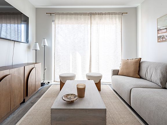 Natural light floods the living area through the large windows, creating a warm and inviting atmosphere that makes coming home a delight.