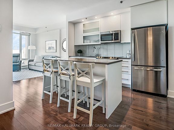 Welcome to Q West!. This stunning, FULLY-FURNISHED one-bedroom, one-bathroom unit features rich hardwood flooring, high ceilings, open-concept living spaces, and expansive windows that flood the unit with natural light. The all-white kitchen features granite countertops, stainless steel appliances, in-unit laundry and a kitchen island, perfect for entertaining, and great space for a workstation if you are working from home. The spacious living room is adjacent to the kitchen and has access to the private balcony. This location is within walking distance of locally owned cafes, artisan bakeries, restaurants, breweries, LCBO, and grocery stores. The unit comes with one underground parking spot. The Unit comes with one underground parking spot.