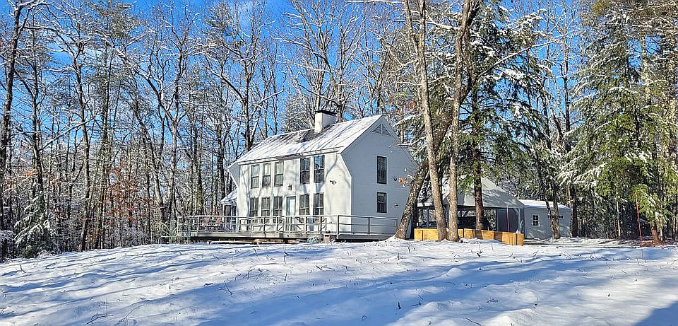 Very private 5 acre. 2BR/1BA, 1,469 sq ft Contemporary with an open floor plan. Potential for 3rd BR and Bath in the walkout and windowed lower level and/or lots of land for an addition. South facing with large windows allows for passive solar heating. Center chimney with 3 flues allows for alternative wood heat. This home features a large screened porch and HUGE sunny deck to enjoy the natural beauty of the land. 5 minutes to Goffstown and 20 minutes to Manchester/highways in a quiet country setting a world away from the hustle and bustle!