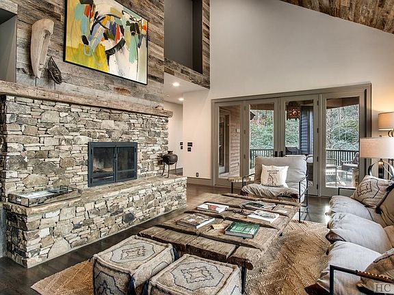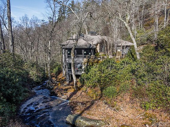 Situated on 3.6 acres directly on Salt Rock Creek in Highlands Falls Country Club just minutes from downtown Highlands, sits this unique 5000+ sq ft home. This is a must see one-of-a-kind luxury property. Beautiful Salt Rock Creek cascades in a waterfall along the side of the home and falls into a pool before wrapping around the back in a babbling stream. Thanks to the architecture you can enjoy the view from most rooms. The soaring ceilings in the entry hall set grand expectations for this residence and it does not disappoint. The rustic chic barnwood ceiling throughout the main level give the home an inviting feel. The stone wood burning fireplace with barnwood accents is the focal point of the living room. The eat in chef's kitchen features a gas cooktop with pop up backdraft, built in refrigerator, ice maker, wine cooler, Miele coffee bar, wall oven and warming drawer. From the kitchen you have direct access to one of the two 400+ sq ft porches both overlook the cascading waterfall and Salt Rock Creek. This one also has a wood burning stone fireplace with built in wood rack. Also, directly off the kitchen, is a keeping room with a wall of windows looking out at the waterfall and access to the Creekside stone patio with a masonry wood burning fireplace. The spacious master bedroom suite is located on the main level with large walk-in closet and ensuite master bathroom featuring a soaker tub to unwind in, and an ample walk-in shower and double vanities. The top-quality feel continues throughout the home with barnwood accent walls and premium finishes everywhere you look. The Lower-Level offers a large family/game room with access to the 2nd screened porch, 3 guest suites, one with an attached kids' playroom and an office. The sounds of falling waters can be heard throughout the home. The home has been well maintained and the interior has just been freshly painted. Membership in the beautiful Highlands Falls Country Club is not a requirement to live here.