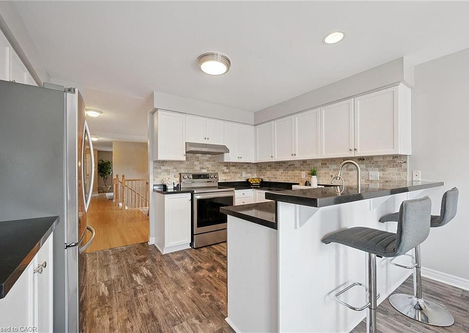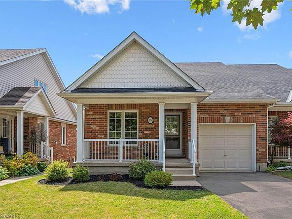 Beautifully renovated FREEHOLD townhouse bungalow tucked into Guelph’s desirable east end! This rare gem blends the ease of main-floor living W/stylish updates & zero condo fees—dream come true for downsizers, professionals or anyone craving low-maintenance comfort. Homes like this don’t come up often, don’t miss your chance to call it home! Step inside to gleaming hardwood beneath a flood of natural light in spacious living room. Open-concept dining area sets the stage for family dinners & casual entertaining. Renovated kitchen in 2023 shines W/white cabinetry, granite counters & stone backsplash. Breakfast bar is perfect for casual bites & eat-in dining area opens onto upper deck. On the main floor you’ll find 2pc bath W/convenient laundry right beside. Spacious primary bdrm with 3pc ensuite W/sleek vanity & W/I glass shower. Finished W/O bsmt delivers versatile living: large rec area W/sliding doors to backyard plus an office, add'l bdrm & 4pc bath—perfect for guests, hobbies or multi-purpose use. All bathrooms upgraded in 2023 giving home a fresh modern feel. Unwind in fully fenced backyard W/professionally landscaped gardens & paved patio that’s perfect for relaxing & entertaining. With an upper deck & lower patio this space offers 2 levels of enjoyment whether you’re soaking up sun, dining W/friends or enjoying green surroundings. Exterior deck & stairs re-stained in Aug 2025 so you can enjoy a fresh updated space. Front porch & attached garage provide curb appeal & practicality W/ample driveway parking. Just steps from trail along Hadati Creek & short walk to Peter Misersky Park including off-leash dog area—outdoor enthusiasts & pet owners alike will feel right at home. Downtown shops, dining & services are just mins away. Mechanical updates: furnace & AC 2020, owned HWT 2021 & water softener 2025. Combining thoughtful updates, functional design & prime location this bungalow-style townhome delivers carefree living in a vibrant highly walkable neighbourhood!