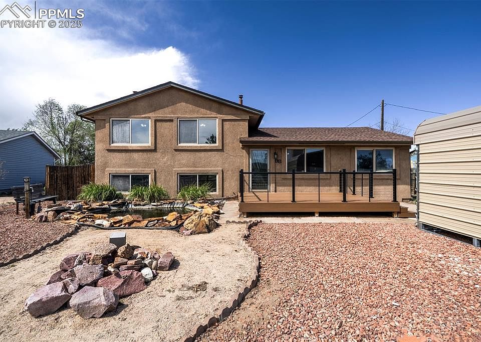 Beautifully Updated 4-Bed, 3-Bath Home in Security-Widefield! This move-in-ready home features fresh interior paint, new carpet, and beautifully refinished natural hardwood floors. The spacious kitchen includes a new sink and dishwasher, with room for a large dining table. Upstairs you'll find three bedrooms with hardwood flooring. The lower level features a private primary suite with a custom walk-in closet and spa-style shower. Enjoy mountain views from the large front deck, a peaceful front yard fish pond, and a fully fenced backyard with two storage sheds—one oversized with electricity, perfect for a workshop. Bonus enclosed sunroom with walk-out access to the backyard. Conveniently located near Fort Carson, shopping, dining, and parks!