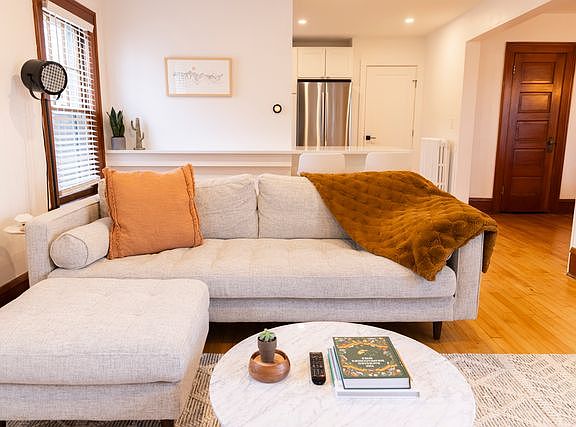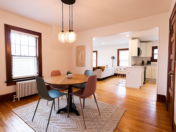 This is a private, fully furnished apartment just southeast of the Five Sisters neighborhood. Completely remodeled, but kept the original charm. New kitchen, new bathroom with tub/shower, washer/dryer in unit, air conditioning and new appliances. The kitchen is fully stocked with dining and cookware. There are two porches: a small outdoor porch and a 3-season porch that is just off the living room. There are two uncovered, off-street parking spaces available and garage storage available. The primary bedroom has a queen bed with a desk. The second bedroom has a bunk bed with two twins. Utilities includes: gas, electric, garbage, sewer, water, wifi, snow removal and lawn care. Small dogs negotiable. Rent includes utilities: water, sewer, trash, gas, electricity, wifi, lawn care and snow removal. No smoking. Can possibly extend lease longer than 6 months.