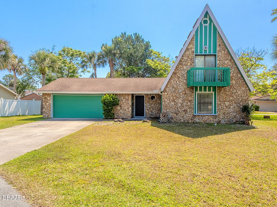 Located in the Gated Community of Pelican Bay, Unique A-Frame 3 Bedroom, 2.5 Baths with a 2 Car Garage. The primary suite is located on the first floor. The 2 guest bedrooms are upstairs as well as a full bath. Each guest bedroom has its own balcony. Pelican Bay is Centrally located in Daytona Beach with easy access to I-95 and I-4.