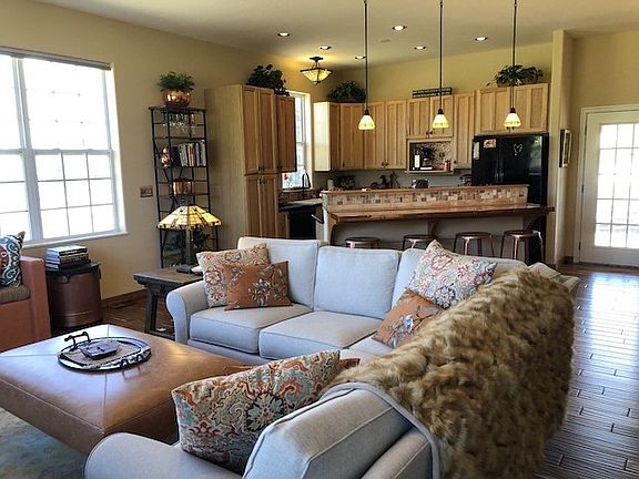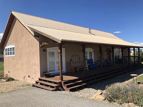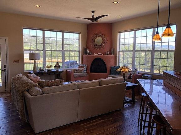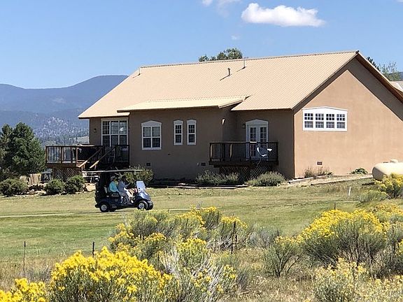 Beautiful stucco territorial style house snuggled up against the golf course fairway. Single level home with easy driveway access. Located well to all the Angel Fire amenities. Fantastic Wheeler Peak Views through living room windows and off back deck. Wood floor throughout the house and comes partially furnished . Primary bedroom is good size with large double sinked bathroom, jetted tub and plenty of closet space. Guest bedrooms share a bath and are beautifully decorated. Laundry room in the middle of the floor plan makes it easy for all to access and has plenty of storage to boot. Location , location, location.