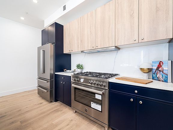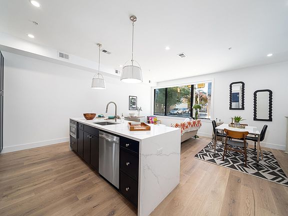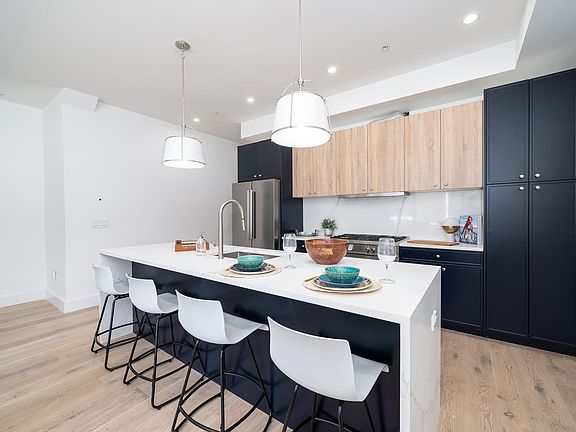Step into this brand-new, thoughtfully designed two bedroom, two bath home in vibrant Jersey City Heights. Set on a corner lot with a beautiful red brick exterior, light streams into the spacious open-concept floor plan showcasing modern finishes and wide plank hardwood floors. Oversized windows showcase the eat-in kitchen, finished with modern black and natural light oak custom cabinetry, white quartz waterfall countertops plus matching backsplash. Premium Bertazzoni appliances add additional quality and sophistication, making the ideal space for budding chefs or entertaining.