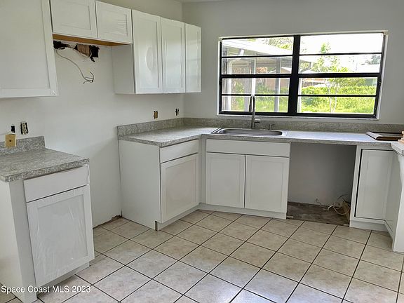 Located in a beautiful area of Palm Bay, this 3/2 split floor plan has a nice sized back yard with wooded property to one side and a sizable natural barrier in back. NEW ROOF, new garage door, new paint inside and out, new vanities and sinks in the bathrooms, new cabinets, countertops and sink in the kitchen! Just add your favorite appliances and lighting fixtures! Large, open living room and tiled, screened in back patio... truly a great home in a great neighborhood under $300k! Don't miss it!