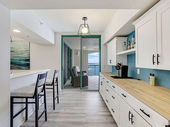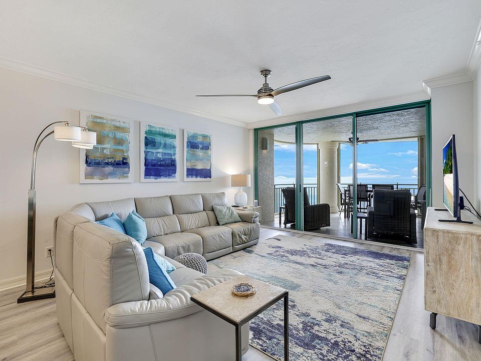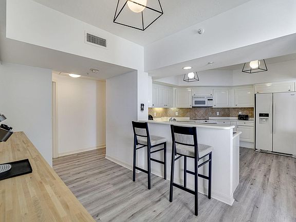 The interior features a spacious open-concept floor plan with pleasant furnishings, neutral lvt flooring throughout, plantation shutters, crown moldings, and custom mirrors. The upgraded Poggenpohl cabinetry and expanded kitchen design add to the condo's appeal. Additionally, there is an enclosed elevator foyer exclusive to the top levels, and the unit has been meticulously maintained.