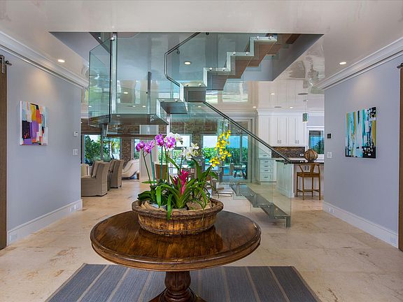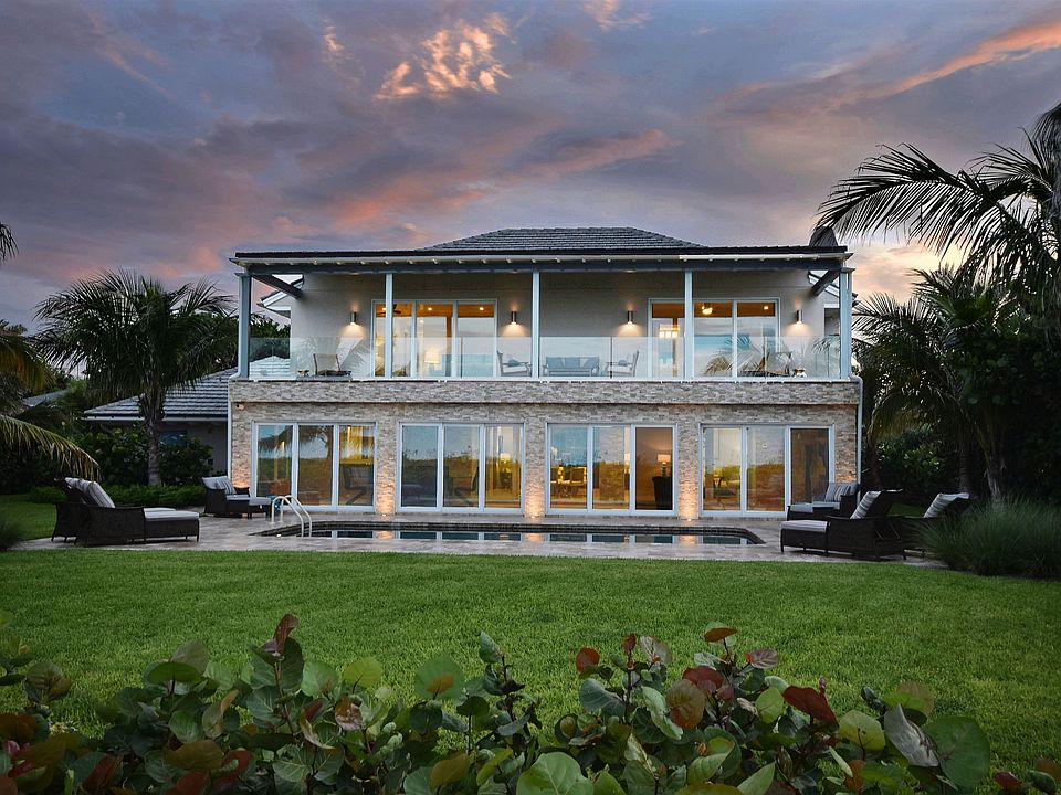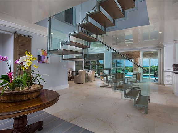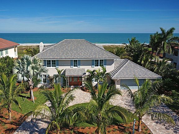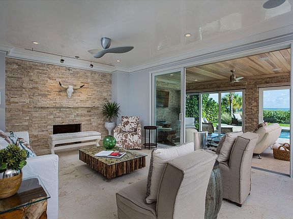 AUCTION: April 29th.Selling Without Reserve.A rare find in peaceful Castaway Cove, 980 Crescent Beach Road offers a completely renovated oceanfront estate, now virtually brand new. From the exterior a traditional faade awaits, while inside a modern aesthetic in rich materials surprises all who enter. With idyllic Treasure Coast views and chic outdoor living options, enjoy the best of Vero from within this sought-after, ocean-to-river community just south of charming downtown.Location Crescent Beach Road, Vero Beach, Florida. A brand-new top-to-bottom renovation with no expense spared, resulting in virtually new construction, this direct oceanfront estate is a rare find in peaceful Castaway Cove, a sought-after gated Ocean-to-River community just south of Vero Beachs charming seaside village.Property Aquamarine waters and emerald foliage give idyllic surroundings for inspired oceanfront living in this picture-perfect estate. By the dune walkway, an oceanfront lounge terrace surrounds the fountained pool. The tropical landscape showcases a Bismarck palm and banyan tree.Residence Equal parts beauty and practicality, this stunning residence gives traditional architecture a sophisticated modern sensibility in artful interiors with coastal-themed accents. Floors are finished in beach limestone and engineered washed white oak, under polished plaster ceilings giving a subtle reflective sheen. Four bedrooms, four and a-half baths, Control4 home automation, and a two-bay garage are included in 4,328 A/C square feet and5,226 total square feet, with exquisite furnishings additionally available. Entering the foyer gives a dramatic view past the glass-and-steel staircase into the breathtaking oceanfront great room, set off by a floor-to-ceiling stacked limestone fireplace, glassed with airy view-filled window walls here and in the adjoining loggia by the pool. Flowing openly for easy entertaining, the epicureans kitchen has white quartz and Blue Pearl granite counters, a Wolf dual-fuel range, Sub-Zero refrigerator and wine cooler, and Bosch dishwasher. Sliding barn doors enter the media room with built-in speakers and wet bar. A bedroom, full bath, and powder room are also on the main level. Upstairs, three bedroom suites feature the serene window-walled oceanfront master suite, opening to a fabulous glass-railed balcony giving an unobstructed vista. The spa-like master bath features a sculptural soaking tub, glassed shower, and Tadelakt stone plaster finishes.
