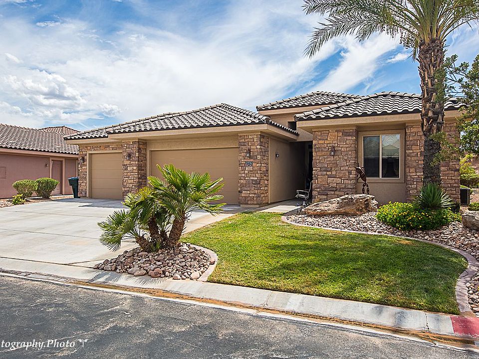 Enjoy the views! Spectacular southern mountain views! Elevated golf course views! Water views! from a great lot in this smaller, gated community. This beautiful 2209 SF home has it all including 4 BR, 3 BA, and that much sought after 3 vehicle garage (797 SF). One of the BR/BA is located in the attached casita with a separate entrance-perfect accommodations for family & friends. High ceilings & 8 foot doors throughout. Nicely upgraded kitchen that looks out to the very large, tiled living area with lots of windows letting in natural light. The slider leads out to the extended covered patio where you are greeted by endless, southern views and beautiful landscaping. Do you want a pool? This home is priced right so you have extra $$ to add one in the large side yard. One year home warranty included and no special assessments in this neighborhood. Come enjoy all that Mesquite has to offer. You will love the proximity to the National Parks as well as the bright lights and entertainment of Las Vegas
