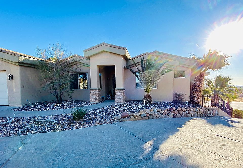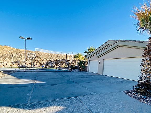 This is an incredible custom family home with gorgeous landscaping and views, perfect for entertaining, and lots of family fun. There is NO HOA, which is difficult to find in Mesquite. It is built on 1.12 acres in a new cul-de-sac, and there is plenty of room to build an additional garage or workshop on the property. The main floor has been updated with beautiful tile that looks like wood, upgraded light fixtures and paint, new floorboard, updated cabinets, beautiful appliances, and plantation shutters. For the exterior, there is a swimming pool with a full-length lap lane and cover, outdoor kitchen, propane fireplace, pergola, hot tub, putting green, sports court for basketball, pickleball or hitting golf balls, baseballs, or softballs, and more. This is a unique home for Mesquite. Please call if you would like to see it. You will love the perfect views of Mesquite's picturesque sunsets. *The sports court is negotiable if not interested. The pad could have other uses, including building a garage or workshop. *Realtors: We are selling our home by owner but will pay a buyer's commission of 3% if you bring a buyer. We are not interested in listing it at this time.