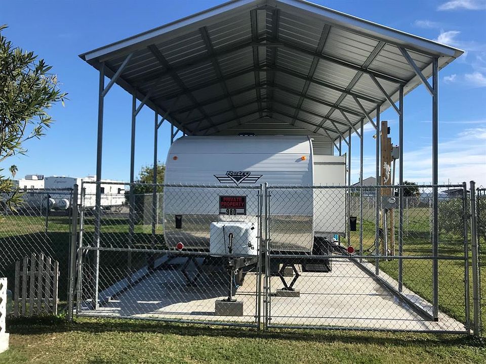 COME TAKE A LOOK AT THIS BEACHSIDE RV PORT WITH ALL UTILITIES IN PLACE. 18FT. METAL RV COVER WITH STORAGE AREA. 18X40 FT CONCRETE SLAB. FULLY FENCED. 50 AMP SERVICE. THIS LOT IS CONNECTED TO THE BOLIVAR PRIVATE SEWER SYSTEM. CLOSE TO RESTAURANTS AND ON A BEACH ACCESS ROAD. 2018 26 FT RETRO RV IS INCLUDED IN FULL PRICE OFFER...RV WILL BE CONVEYED "AS IS".