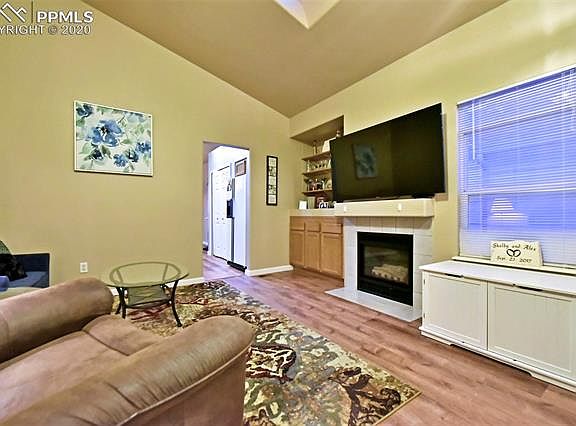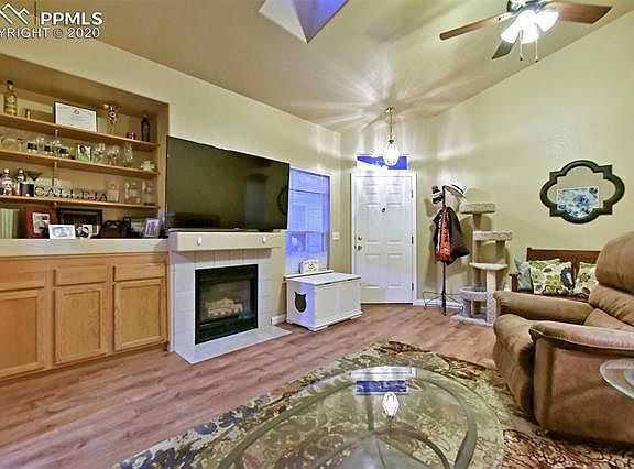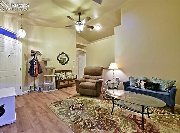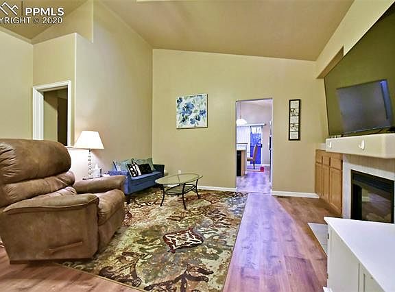 Welcome to this Darling Home with Privacy and Views! Main Level Living! View of Cheyenne Mountain off the Patio! This End Unit Backs to Greenbelt, High Vaulted Ceilings, Lofty and Bright, Skylights, Rooms Feel Larger! Huge Master Suite with Bonus Sitting Area/ Study/Office. New Flooring, 6-Panel Doors, Oversized two car garage! Desirable Well Maintained Gated Community (No Water Bill - HOA pays!) Minutes to Ft. Carson or I-25 and walking Distance to Shopping!