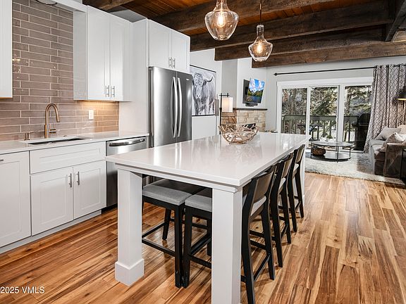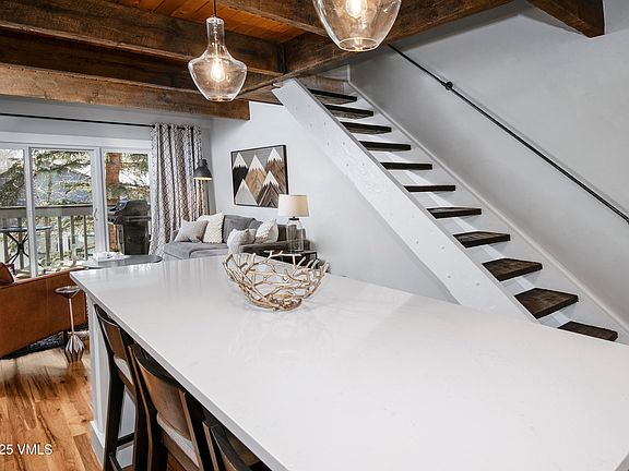 This stunning upper-level condo in the Sandstone neighborhood of Vail offers a perfect blend of luxury and comfort. With two spacious bedrooms and 1.5 elegantly designed bathrooms, this unit is ideal for both relaxation and entertaining. As you enter, you're greeted by a bright and airy open-concept living area that boasts modern upgrades and tasteful finishes. Large sliding glass doors provide breathtaking views of Vail mountain as well as the tranquil creek below, allowing natural light to flood the space. The living room features cozy seating, a gas fireplace and heated radiant flooring perfect for unwinding after a day on the slopes. The upgraded kitchen showcases stainless steel appliances, quartz countertops, and ample cabinet space, making it a dream for any home chef. A convenient island table adds to the functionality, ideal for casual meals or gathering with friends. Fall asleep to the sound of the creek from the primary bedroom, while the second bedroom is equally inviting, perfect for guests or family. Both bedrooms offer ample closet space as well as large dedicated gear storage closet perfect for summer and winter gear. Outside, enjoy the peaceful sounds of the creek from your private balcony, making it a perfect spot for morning coffee or evening relaxation. A short walk to the town of Vail bus system as well as easy access to hiking and biking trails, and proximity to Vail's renowned ski resorts. Overall, this upgraded condo offers a unique opportunity to experience mountain living at its finest, all within a picturesque setting in Vail.
