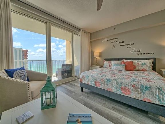 Welcome to your own Deluxe Beachfront Studio Condo..at the Beautiful Shores, in famous Panama City Beach, Florida. Updated with lovely Beach Decor, featuring Stunning Ocean views!