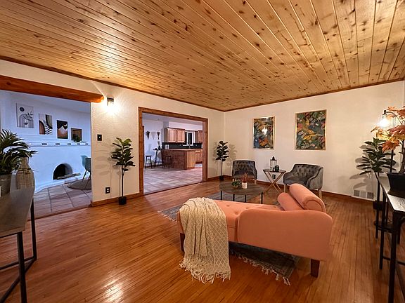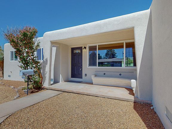 Beautiful Pueblo-style home in desirable NE Mesa Arriba! Completely renovated featuring lots of natural wood and Black / White Deco: new TPO Roof, new Marble White synthetic stucco, new windows, all new LED lighting and plumbing, new contemporary kitchen with Natural Hickory Cabinets, solid wood butcher block counters, new SS appliances, new electrical wiring throughout entire home, drain lines replaced w/PVC, complete new aesthetic bathrooms, original refurbished hard wood floors, gorgeous wood burning Santa Fe Kiva fireplace overlooking extra large dining space. Lovely bright open floor plan that still gives each space it's traditional feel. Freshly landscaped front and backyards. Enjoy the large covered patio while getting a sweet peek of the Sandias. Super convenient to many amenities
