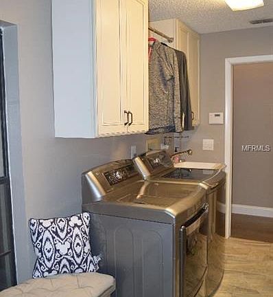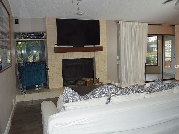 Stunning 3 bedroom, 2 bathrooms, 2 car garage with a pond view. The kitchen and bathrooms have been NEWLY remodeled as well as NEW flooring throughout the home, with 5" baseboards. The kitchen has slate appliances, 42" cabinets, Quartz countertops, with a breakfast bar and walk-in pantry. The living room has vaulted ceilings and a wood burning fireplace. The master bedroom has a walk-in closet and sliding glass doors that lead out to the screen enclosed lanai. Sitting in the lanai you can watch your pets in the fenced in backyard overlooking the pond. The neighborhood of Fairway Springs is located near shopping, schools, restaurants, recreational facilities and Trinity Hospital. No CDD fees and HOA is $275 yearly. All rooms are approximate and should be verified by the buyer.