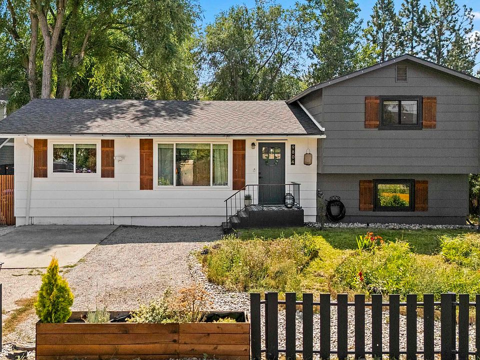 MOVE IN READY! New Roof 2024! Enjoy your backyard oasis at this 4 bed, 3 bath California split floorplan in Spokane Valley! Great room with electric fire place insert, wood mantle, built-in bookshelf. Light, bright kitchen offering granite counters, eat-in bar, 7 stage reverse osmosis water filter, stainless-steel appliances. Main floor also boasts mohawk wide plank flooring, dining area, primary bedroom, fully renovated bath including dual basin sinks, soaking tub with rain shower head. Upstairs features two bedrooms and remodeled bathroom. Downstairs hosts bedroom, bathroom with quartz counter, dedicated laundry room. Renovated covered deck. Fenced in private backyard featuring fire pit, raised bed vegetable garden, storage shed. Mature landscaping with low maintenance, drought tolerant native plants, flower beds. Close proximity to schools. Minutes to parks, restaurants, shopping. Quick access to I-90. Short commute to Downtown Spokane, International Airport, Mt. Spokane, and Coeur d'Alene.