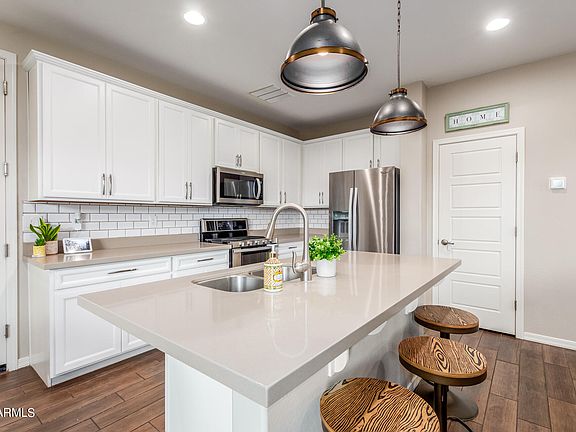 Welcome to your stunning 4 bedroom, 3 bathroom home nestled on a desirable corner lot in the renowned Eastmark community! This spacious residence features a full bedroom and bathroom on the main floor, perfect for guests or multi-generational living.The eat-in kitchen boasts a gas range, elegant white cabinetry, an oversized walk-in pantry, Quartz countertops, a functional kitchen island, and stainless steel appliances. It seamlessly flows into the bright breakfast nook and expansive great room. Retreat to the primary suite, where you'll find a luxurious walk-in super shower, dual sinks with a vanity, and a generous walk-in closet. The 12-foot sliding doors lead to a beautifully landscaped backyard, complete with pavers and a grassy play area. The vibrant Eastmark community offers a wealth of amenities, including parks, pools, a recreation center, a disc golf course, a skate park, and regular community events. Conveniently located near the 202, 24, and 60 freeways, you'll also enjoy easy access to restaurants, grocery stores, and shopping.