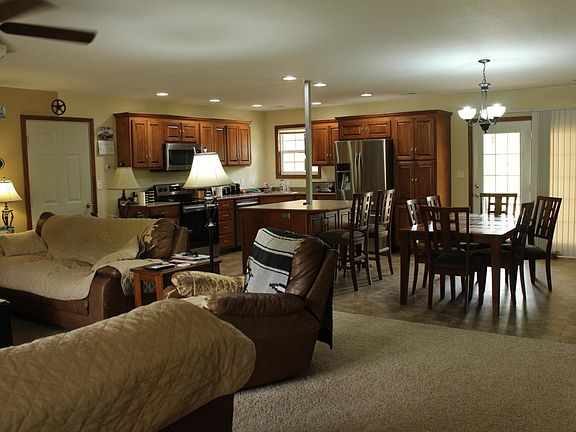 Tired of the City? Ready for the Peace and Quiet of the Country? Enjoy this Isolated 2008 Main Level Ranch. Perfect spot for a Garden and Room for Kids to Play. Open Greatroom Design with High Quality Kitchen Raised Panel Cabinets Plus Center Island and Newer Stainless Steel Appliances. Six Panel Doors and Hot Water Heated Floors plus FAE Heat. Handicap Accessible Door openings. Back Patio Plus Huge Covered Front Relaxing Porch. Shared Well. This is it! The Perfect Private Retreat for Country Living. Located only 6 miles off Highway 54. (Outbuilding doesn't stay)